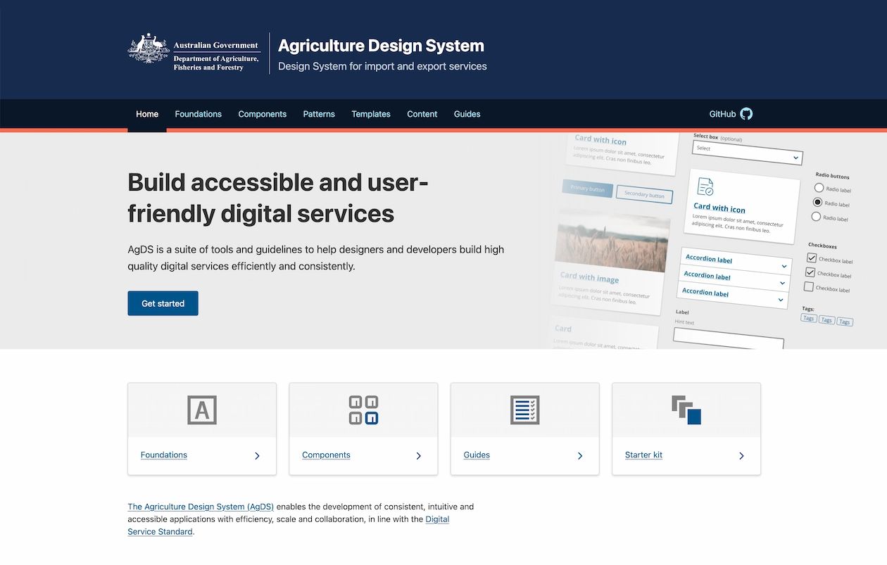 The Agriculture Design System (AgDS) team operates within the Australian Government's Department of Agriculture, Fisheries and Forestry (DAFF). We ensure that digital products and services created by teams within DAFF can be used by everyone, regardless of ability or situation.