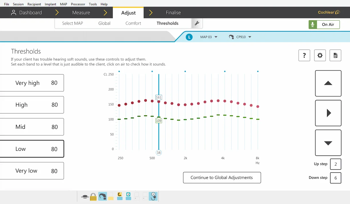 Rather than a confusing open toolbox, each type of a adjustment has it's own task screen. This means we can guide clincians through each task. This screen measures thresholds, the softest sounds a patient can hear. It's visually a lot cleaner, but has everything they need for this task, instead of all the things for all the tasks. This is less disrtacted and confusing.