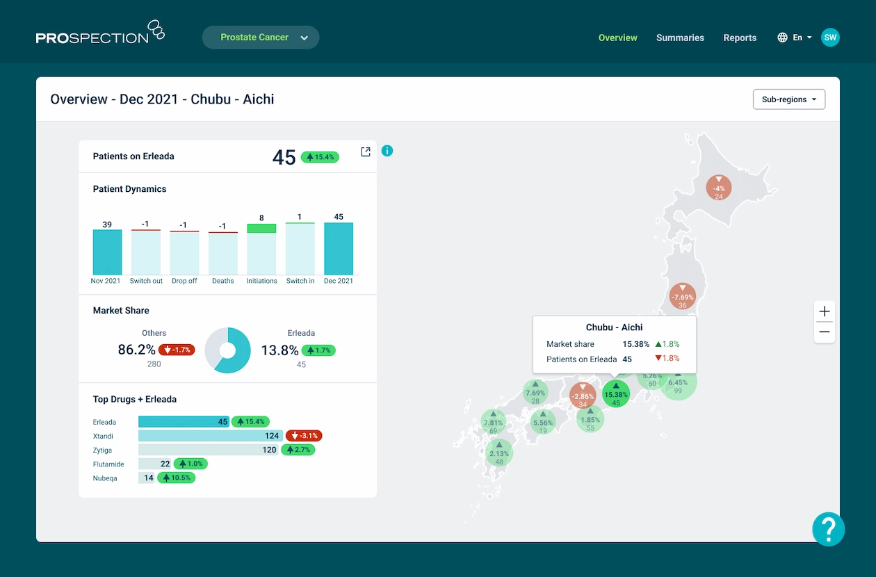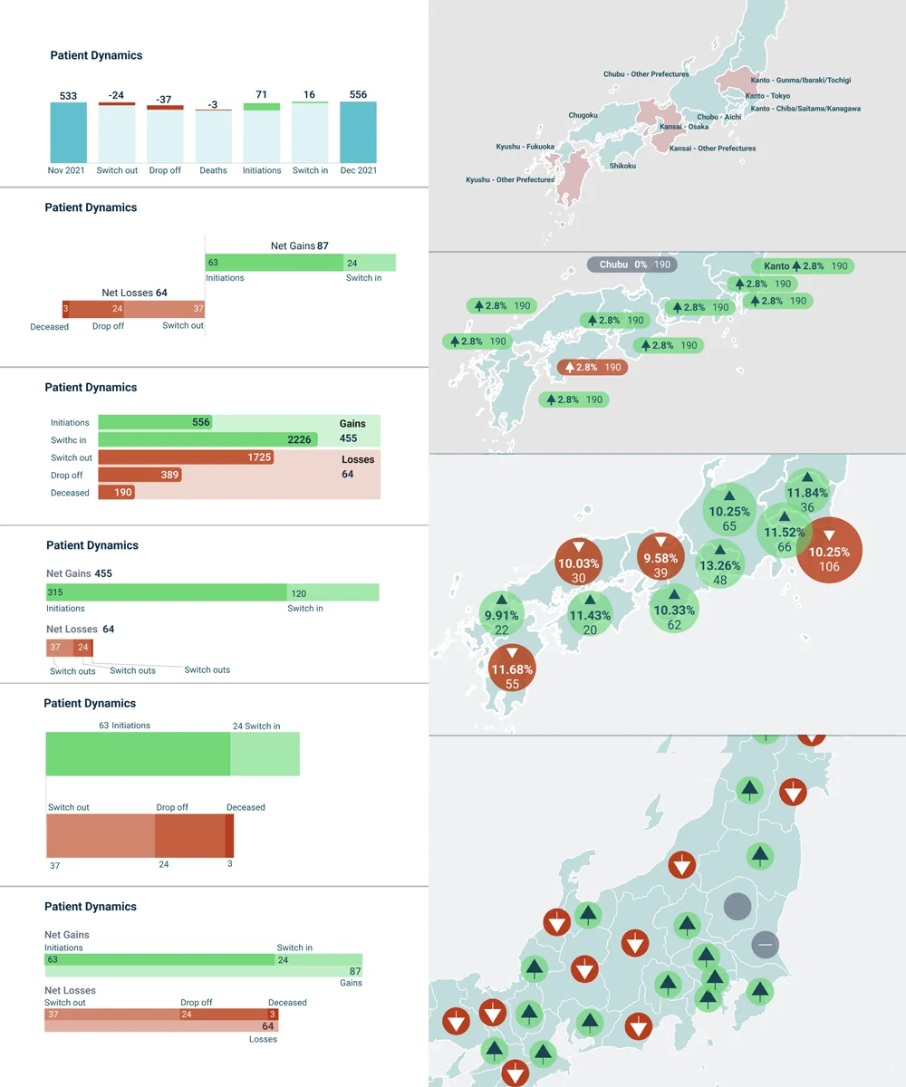 The interactive prefecture maps revealed regional treatment patterns that were previously hidden in spreadsheets—managers could now instantly spot areas with high concentrations of patients on older drugs and strategically deploy sales representatives to educate doctors about newer treatment options. This targeted approach enabled more efficient resource allocation and accelerated patient transitions to more effective therapies across Japan's diverse healthcare landscape.